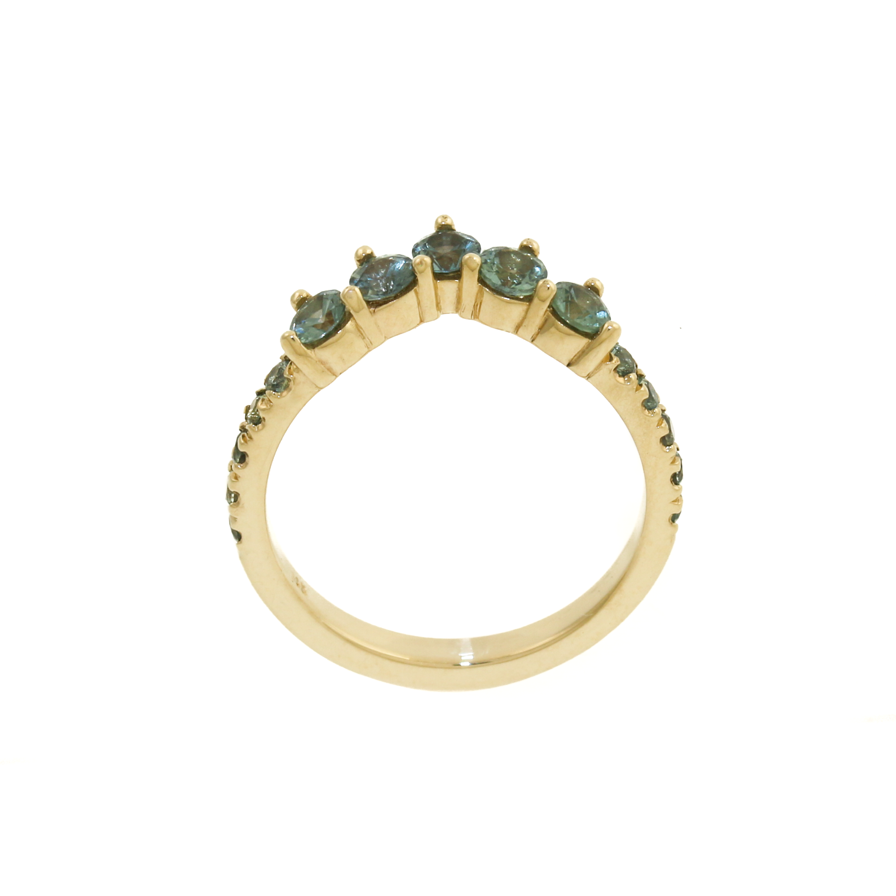 Introducing our 14K Gold Teal Sapphire Tiara Band. Lustrous graduated sapphires form a sleek curved tiara shape, set in lustrious yellow gold. This elegant and versatile ring is the perfect statement piece for any occasion, and it pairs beautifully with a solitaire ring. Cherish its enduring allure as a symbol of luxury and sophistication.